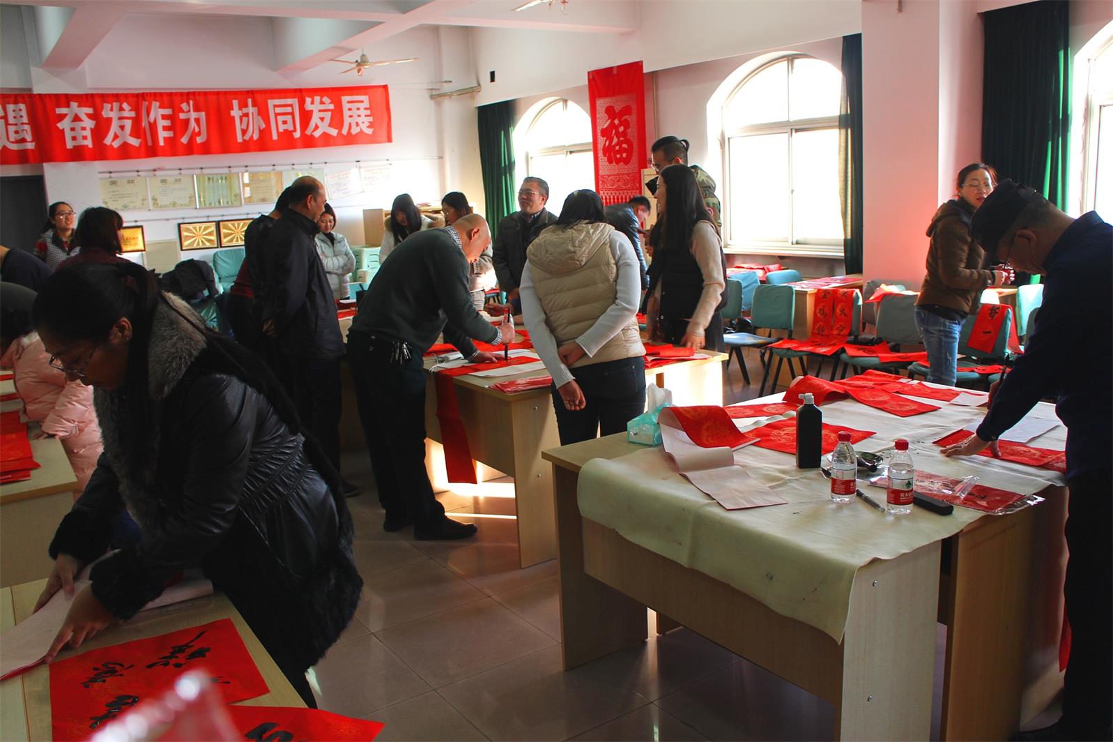 今年當(dāng)然也不能例外!2月2 日下午15 點至 17 點30分,市書法家協(xié)會的多位優(yōu)秀書法家準(zhǔn)時來到五樓會議室為本院職工們免費書寫春聯(lián),大伙兒熱情很高, 現(xiàn)場氣氛歡快,不一會兒各色字體,不同內(nèi)容的大紅春聯(lián)就鋪滿了各個角落。